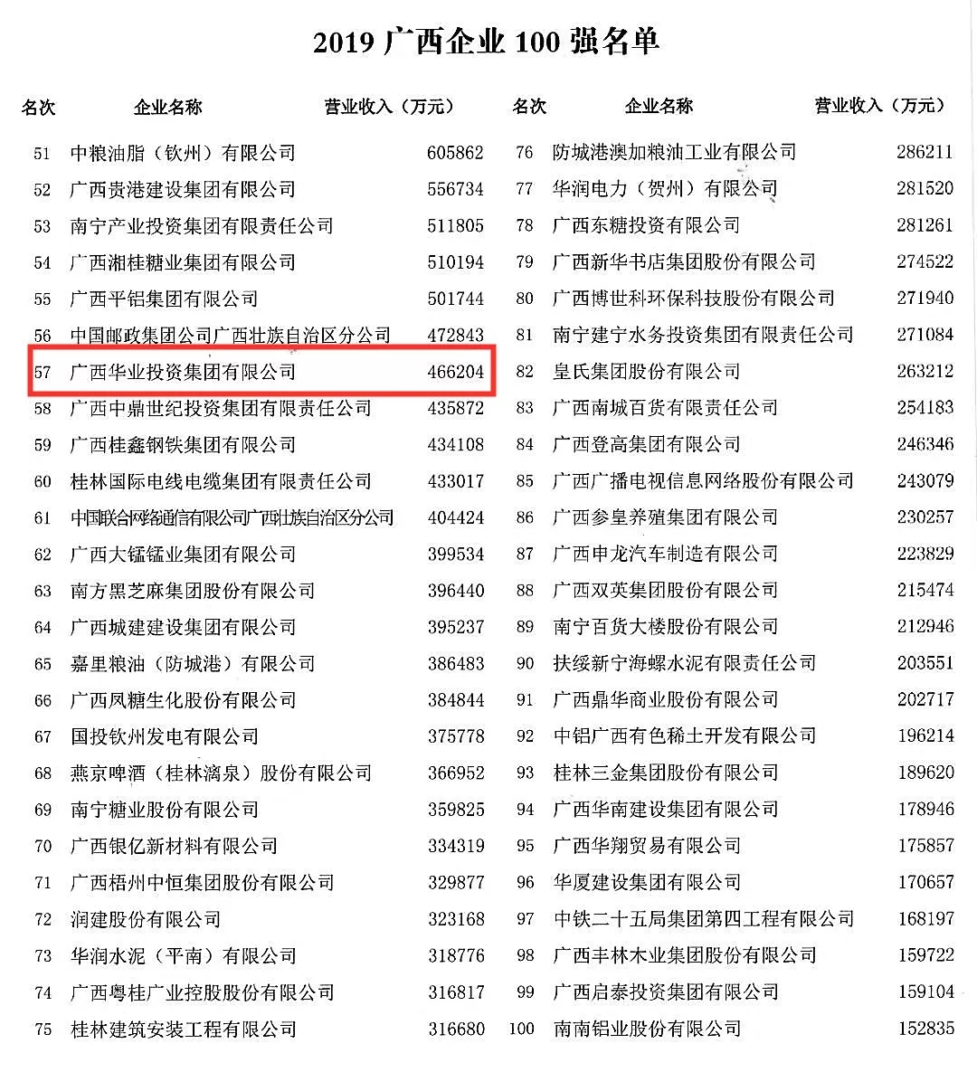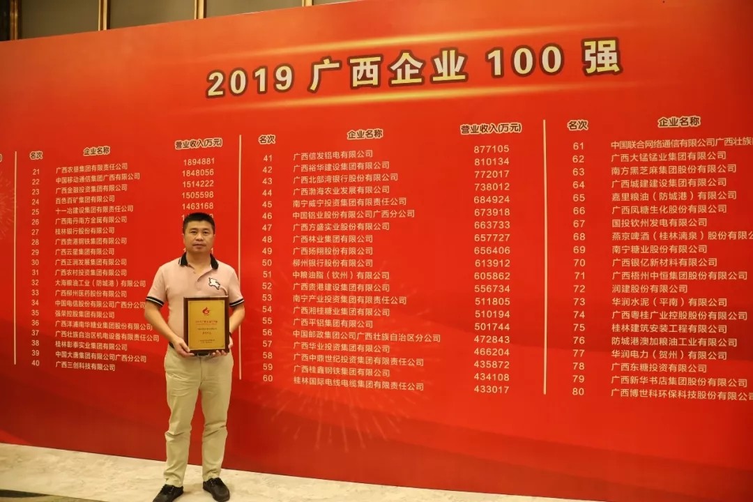 大會發(fā)布了2019年廣西企業(yè)100強等榜單及廣西大企業(yè)發(fā)展主要研究成果。此次評選以2018年企業(yè)營業(yè)收入作為評選標準,共有100家實力雄厚的企業(yè)榮登金榜。其中,廣西華業(yè)投資集團有限公司,憑借營業(yè)收入46.6億元,位列廣西百強企業(yè)第57位,連續(xù)兩年榮獲“廣西企業(yè)100強”榮譽稱號!