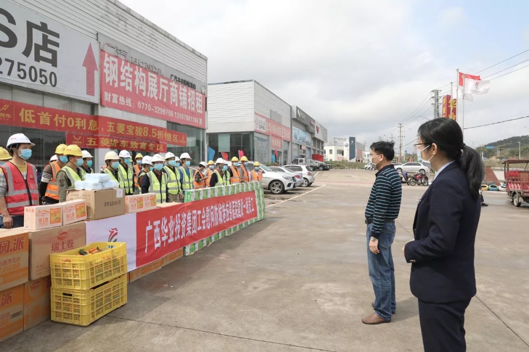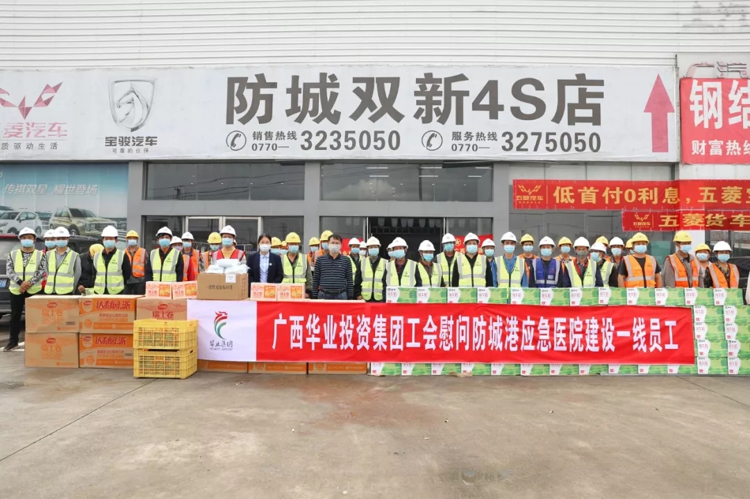 2020年2月15日,廣西華業(yè)投資集團副總裁廖人興、工會主席鐘麗霞代表華業(yè)集團在華業(yè)汽車城慰問連日來奮戰(zhàn)在防城港市第一人民醫(yī)院感染性疾病科應(yīng)急負壓病房項目建設(shè)一線的員工,為他們送去牛奶、水果等慰問品和防護用品,并鼓勵他們同心協(xié)力、一往無前,為抗擊疫情取得最終勝利添磚加瓦。
